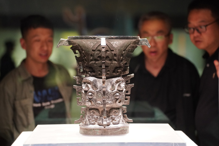 2024年5月9日,游客在陜西寶雞青銅器博物院內(nèi)參觀西周文物何尊。新華社記者 邵瑞 攝
