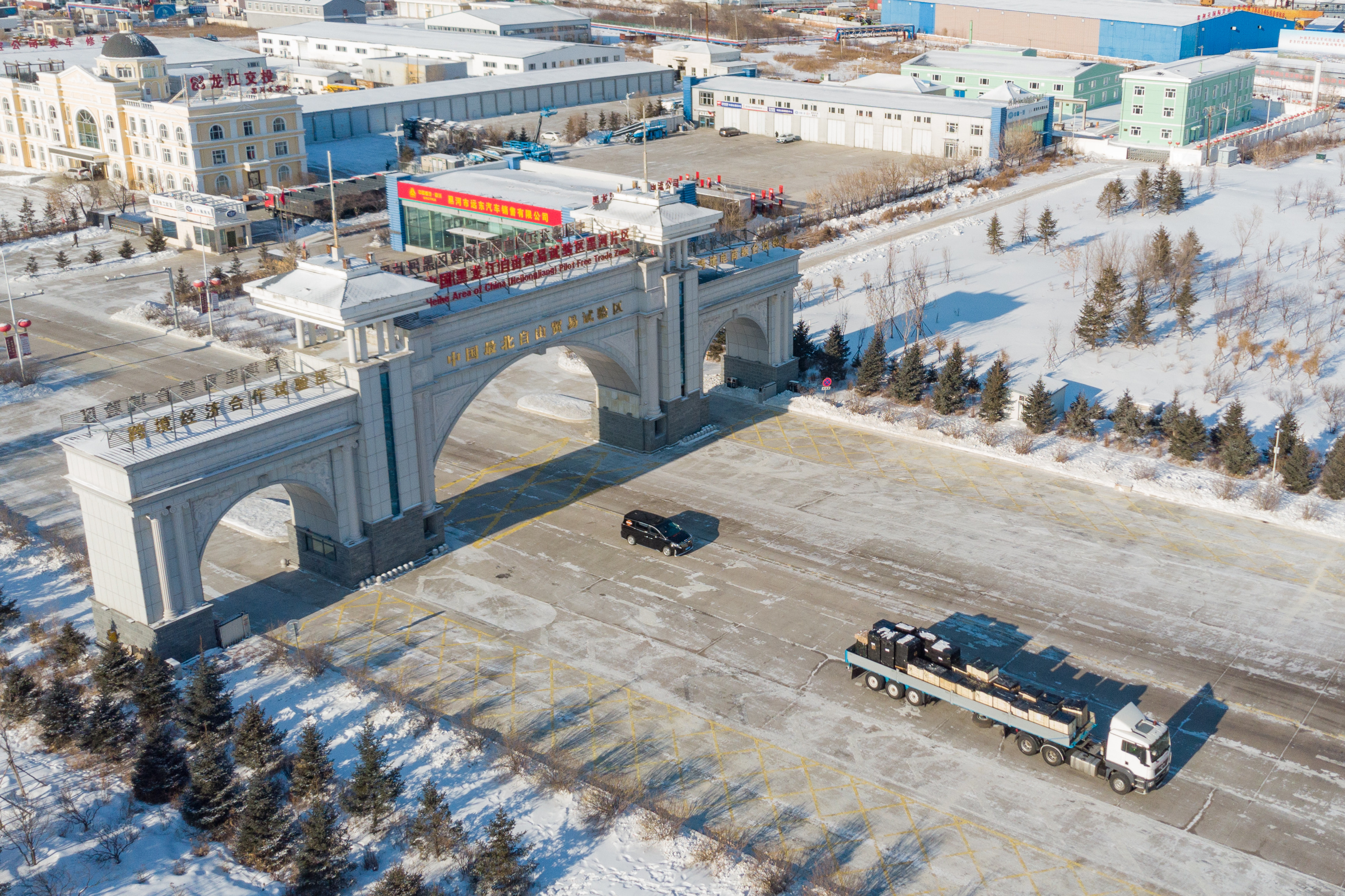 這是中國(guó)(黑龍江)自由貿(mào)易試驗(yàn)區(qū)黑河片區(qū)(2024年1月31日攝,無(wú)人機(jī)照片)。2023年,該自貿(mào)片區(qū)外貿(mào)進(jìn)出口總值達(dá)244.82億元,實(shí)現(xiàn)增幅56.9%,引進(jìn)外資企業(yè)16家,直接利用外資127.3萬(wàn)美元,同比增長(zhǎng)27.3%。