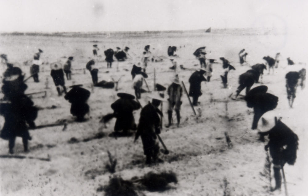 上世紀(jì)東山百姓在沙灘造林(資料照片)。