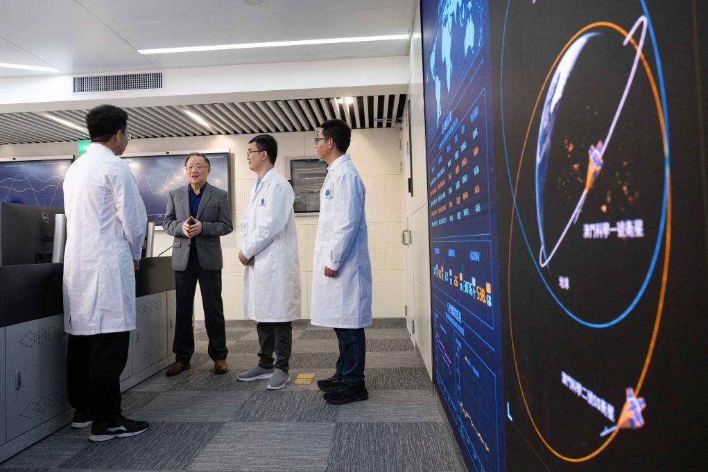2024年12月4日,“澳科一號”衛(wèi)星項目助理研究員尹亮(左一)與同事交流。