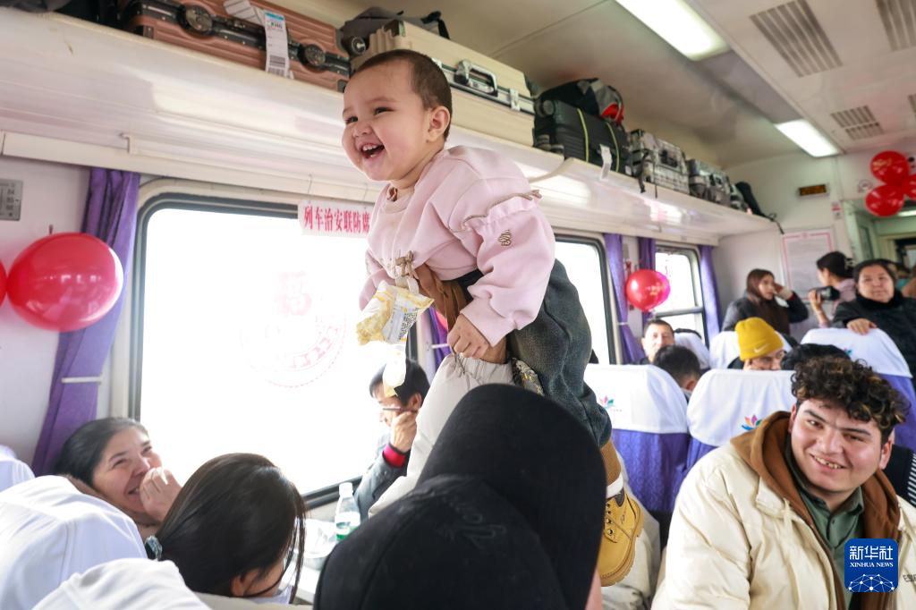 在7557次列車上,一名旅客托起孩子玩耍(1月2日攝)。