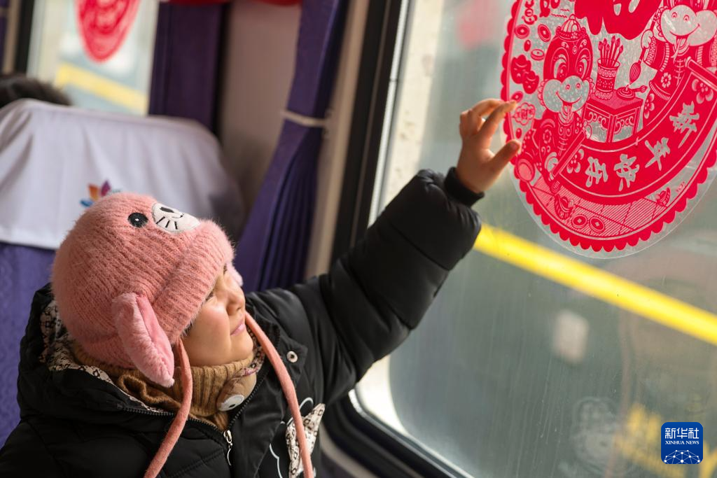 在7557次列車上,小朋友在撫摸窗花(1月2日攝)。