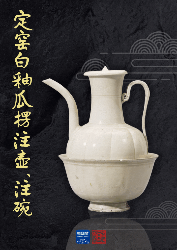 這是收藏在大同市博物館的定窯白釉瓜楞注壺、注碗。注壺通體施白釉,壺口微敞,長弧頸,曲流,矮圈足。注碗口沿外撇,作六出花瓣形。王利霞介紹,古人在注碗中放入熱水,然后將盛酒的注壺放置于碗中加熱,待到合適溫度取出飲用。