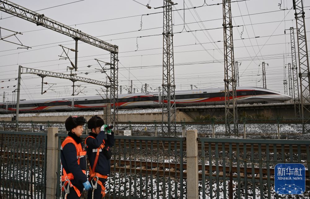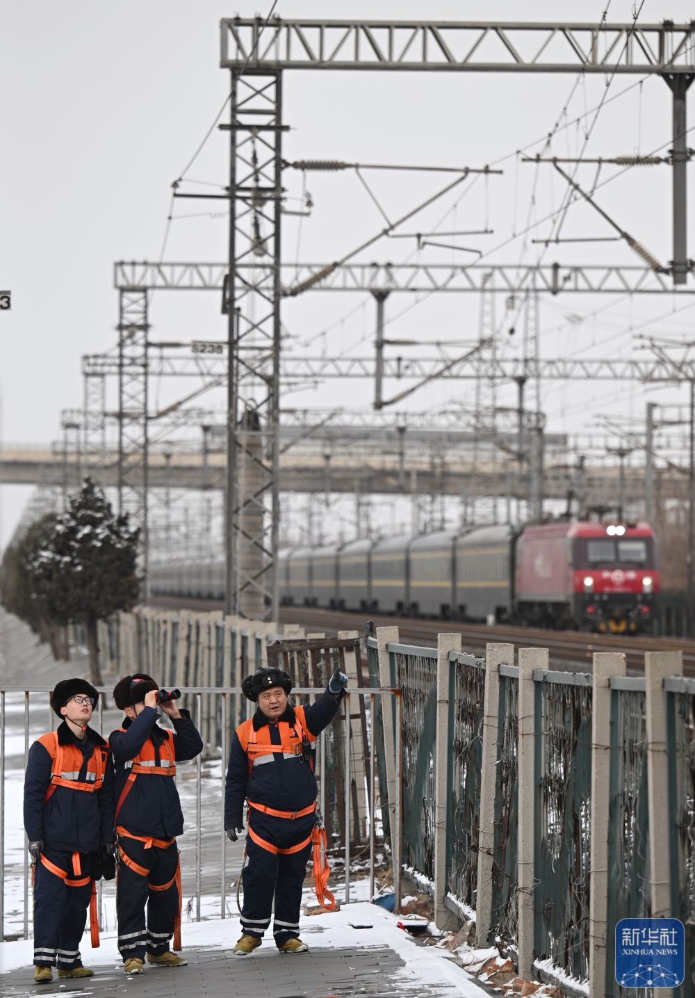 寒潮來襲,中國鐵路北京局集團(tuán)有限公司天津供電段供電維修車間組織應(yīng)急搶險(xiǎn)人員上崗待命,在雪后對(duì)鐵道上方的接觸網(wǎng)運(yùn)行狀態(tài)進(jìn)行巡視,確保春運(yùn)期間供電設(shè)備安全運(yùn)行。