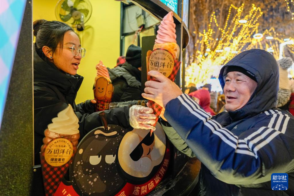 1月30日,游客在哈爾濱中央大街上購買“煙囪冰淇淋”。