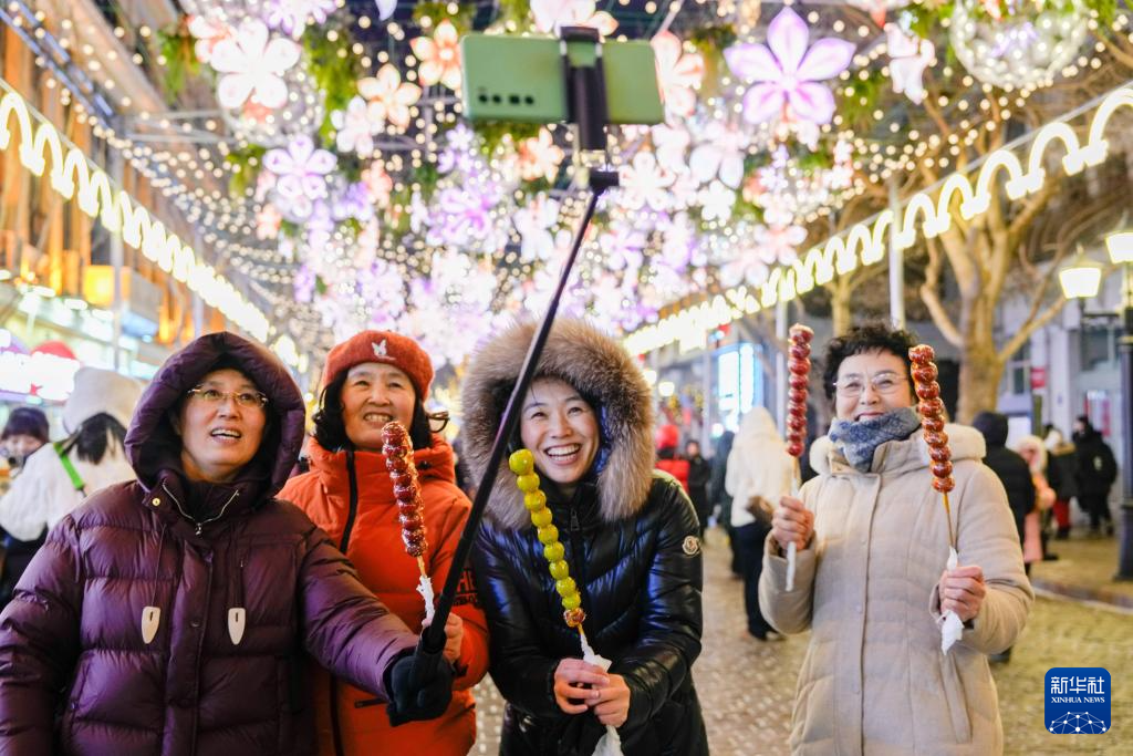1月30日,游客在哈爾濱中央大街上手持糖葫蘆自拍。