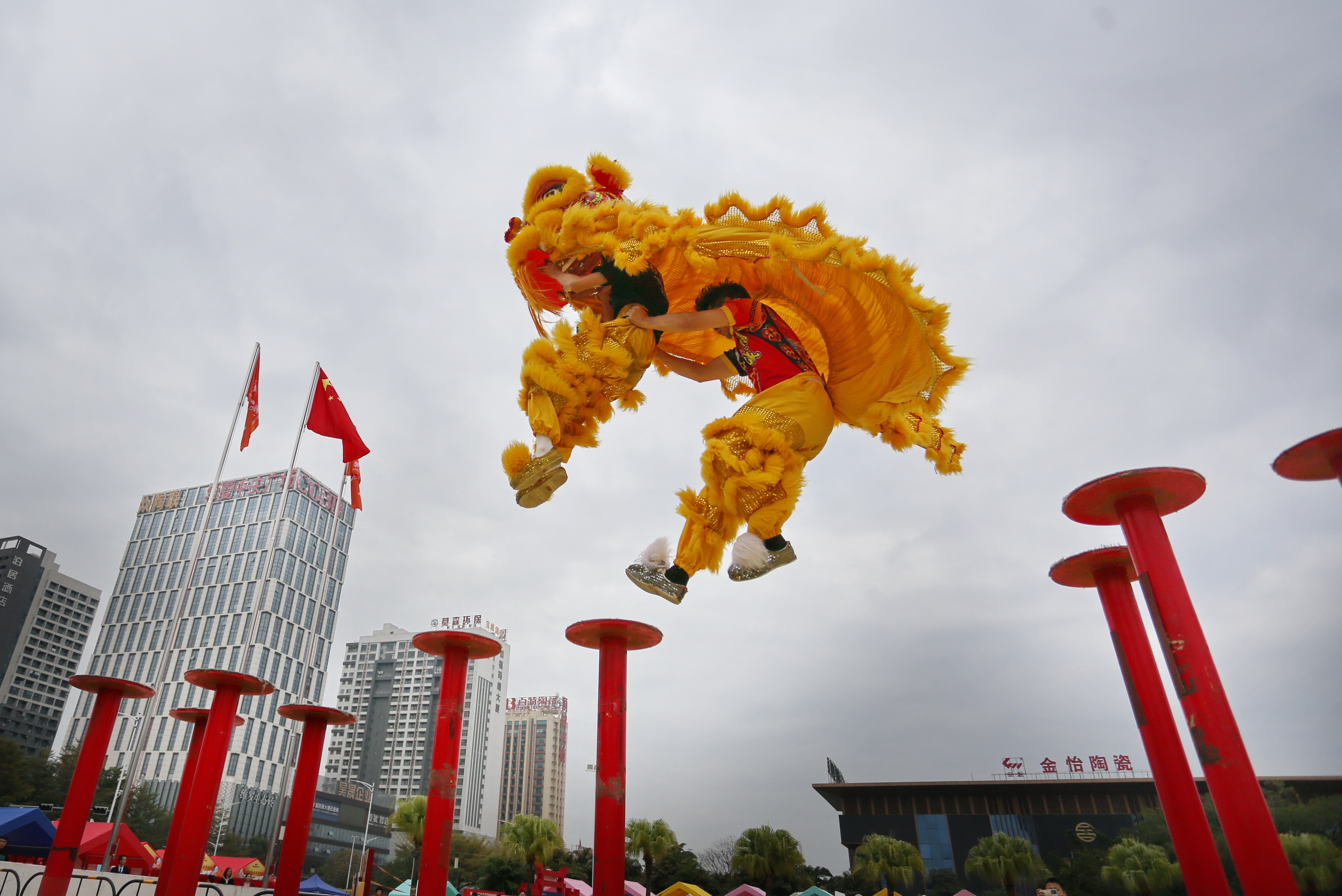 1月22日,鶴山禧誠龍獅隊(duì)在廣東省佛山市禪城區(qū)南莊鎮(zhèn)進(jìn)行梅花樁舞獅表演。