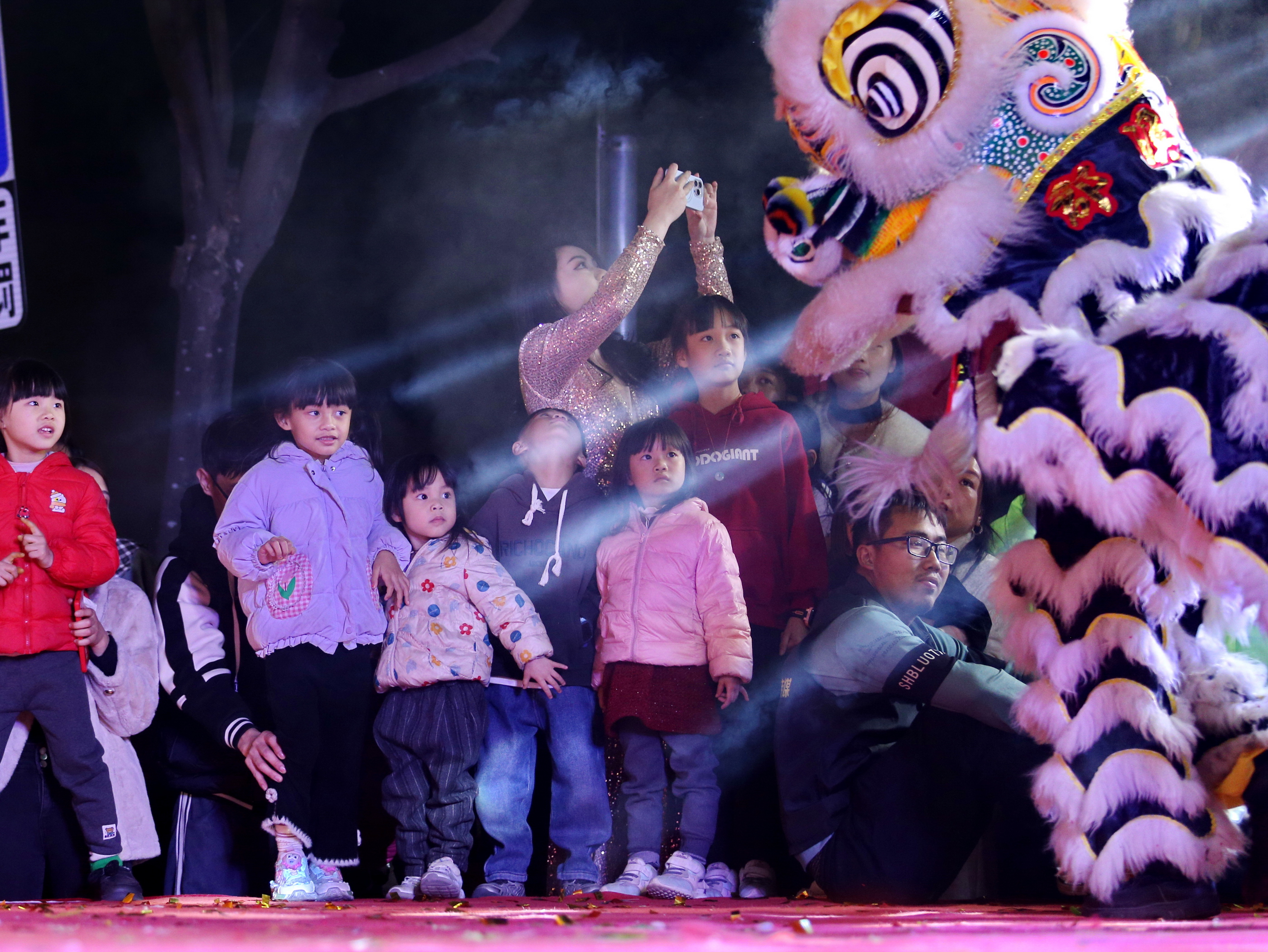 1月19日,在廣東省鶴山市沙坪街道,醒獅表演吸引了一群小朋友駐足觀看。