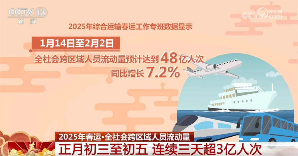 來(lái)自2025年綜合運(yùn)輸春運(yùn)工作專(zhuān)班數(shù)據(jù)顯示:1月14日至2月2日,全社會(huì)跨區(qū)域人員流動(dòng)量預(yù)計(jì)達(dá)到48億人次,同比增長(zhǎng)7.2%;正月初三、初四、初五已連續(xù)三天超3億人次,均超去年同期水平。