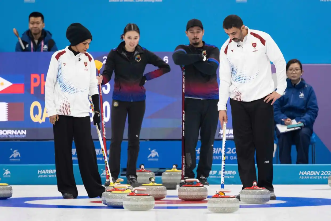 △2月5日,亞冬會冰壺混雙循環(huán)賽B組第3輪比賽中,菲律賓隊11比3戰(zhàn)勝卡塔爾隊。