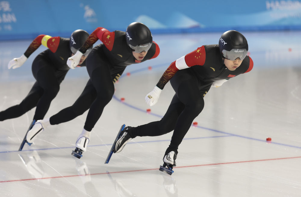 2月10日,中國隊(duì)選手高亭宇(右)、寧忠?guī)r、廉子文(中)在比賽中。當(dāng)日,第九屆亞冬會(huì)速度滑冰男子短距離團(tuán)體追逐賽在哈爾濱舉行。中國隊(duì)獲得冠軍。新華社記者 呂帥 攝