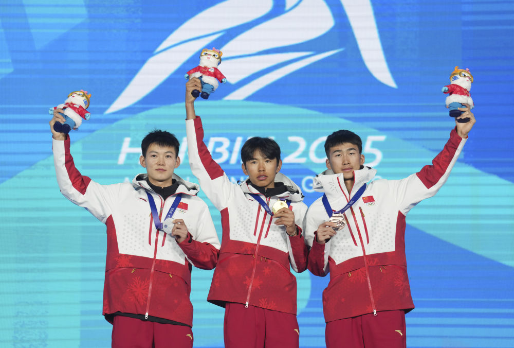 2月9日,布魯爾(中)、張成浩(左)和畢禹新在頒獎(jiǎng)儀式上。當(dāng)日,在第九屆亞冬會(huì)滑雪登山男子短距離決賽中,中國選手布魯爾、張成浩和畢禹新包攬前三名。新華社記者 王松 攝