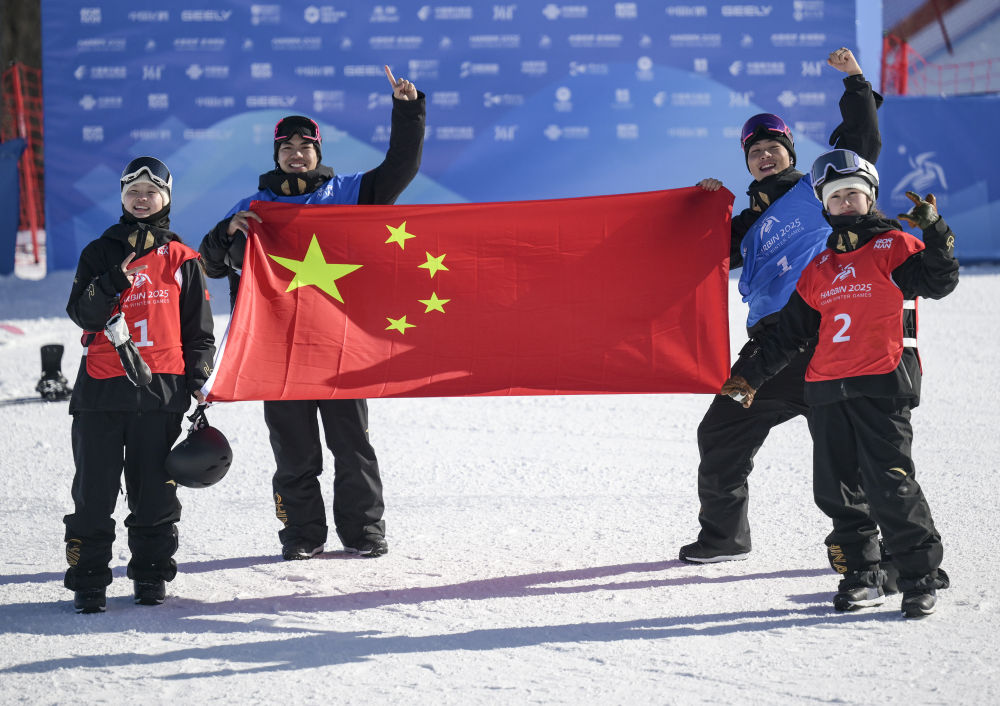 2月10日,中國選手張小楠、楊文龍、姜鑫杰與熊詩芮(從左至右)在比賽后慶祝。當(dāng)日,在亞布力舉行的第九屆亞冬會(huì)單板滑雪女子大跳臺(tái)決賽中,中國選手熊詩芮奪冠,張小楠獲得亞軍;在男子大跳臺(tái)決賽中,中國選手楊文龍奪冠,姜鑫杰獲得亞軍。新華社記者 牟宇 攝