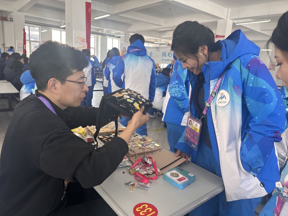 換“pin”,也就是交換徽章,在世界體育大賽中歷史悠久。在早期的奧運會上,賽事參與者通過交換用于身份識別的圓形紙牌,表達對彼此的美好祝愿。如今,換“pin”已成為各大體育賽事中的社交傳統(tǒng),亞冬會也不例外。
