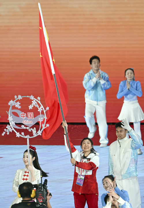 自由式滑雪運(yùn)動員徐夢桃擔(dān)任中國代表團(tuán)的旗手。35歲的她,是中國雪上項(xiàng)目的傳奇人物,實(shí)現(xiàn)了冬奧會、世錦賽、世界杯等多項(xiàng)大賽的大滿貫,成為中國雪上項(xiàng)目首位實(shí)現(xiàn)“全滿貫”的運(yùn)動員。在本屆亞冬會上,她以 90.94 分的成績奪得女子空中技巧金牌,還帶領(lǐng)團(tuán)隊(duì)在多個(gè)項(xiàng)目中斬獲佳績。她堅(jiān)韌不拔的精神和卓越的競技表現(xiàn),正是中國冰雪運(yùn)動員的代表。