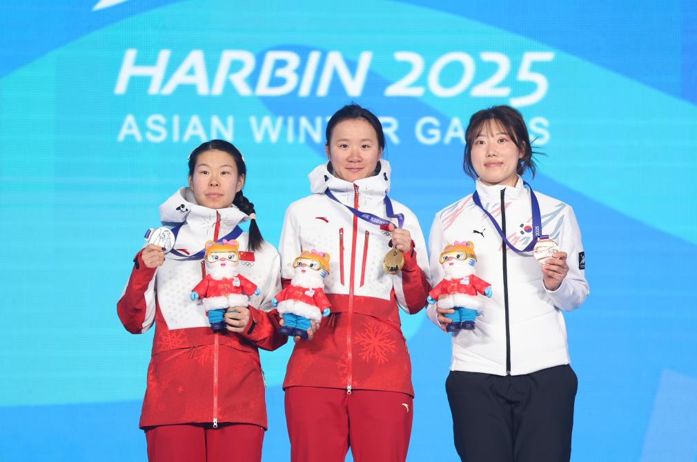2月10日,第九屆亞冬會速度滑冰女子3000米決賽在哈爾濱舉行。中國選手楊濱瑜、韓梅、太智恩分別獲得冠、亞、季軍。新華社記者 王曦 攝
