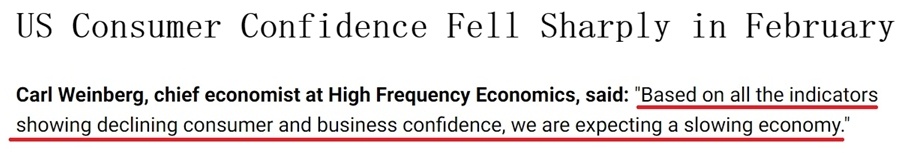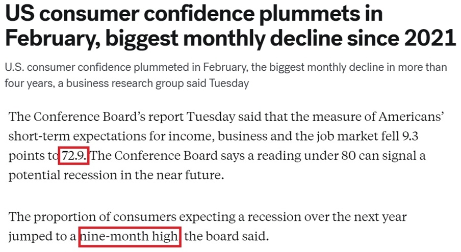 各家媒體紛紛用“暴跌”“直線下降”“急劇惡化”等詞匯來形容美國消費者信心的顯著下滑。