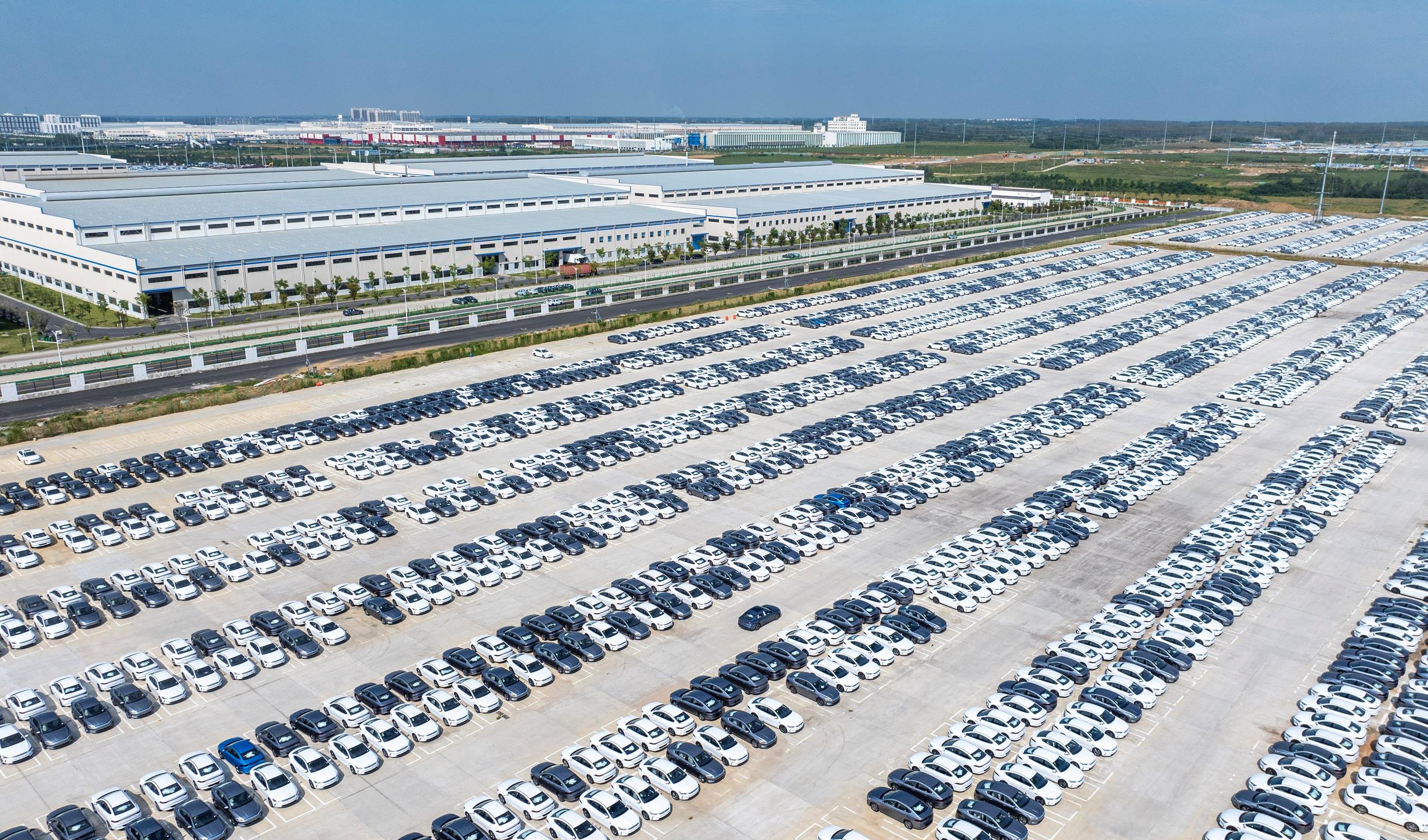△2024年9月,安徽合肥,整齊停放的新能源汽車正在等待裝車銷往國內(nèi)外市場。