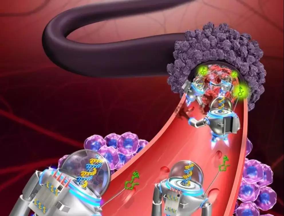納米機器人或許將開啟一場醫(yī)療革命??茖W家設想,納米機器人能夠在人體血管中巡航,精準清除血栓、修復癌癥細胞,就像快遞小哥一樣定點遞送藥物,實現(xiàn)“無創(chuàng)手術”。圖為用于腫瘤治療的智能型DNA納米機器人示意圖。國家納米科學中心供圖