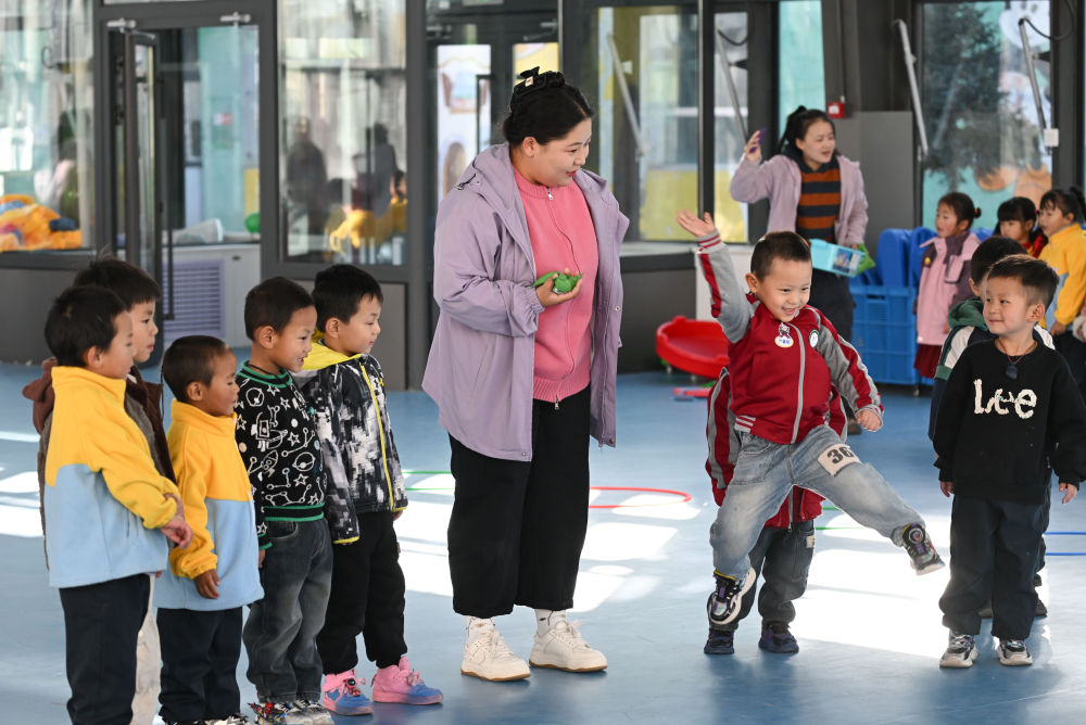 2024年11月14日,在青海省海西蒙古族藏族自治州天峻縣民族幼兒園,小朋友們?cè)诶蠋煄ьI(lǐng)下上體育課。新華社記者 張龍 攝
