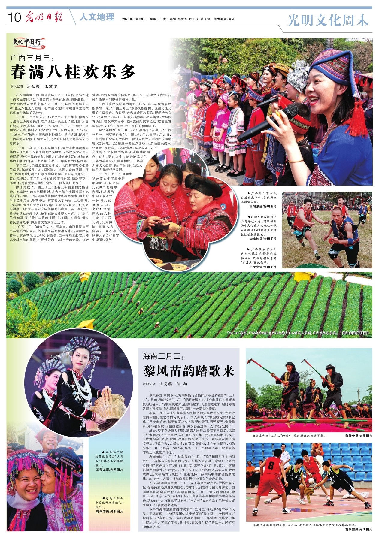 廣西南寧市人民公園白龍湖畔,各族群眾在對唱山歌。喻湘泉攝/光明圖片 廣西龍勝各族自治縣龍脊鎮(zhèn)小學(xué),國家級非物質(zhì)文化遺產(chǎn)代表性傳承人潘繼鳳(右)向孩子們傳授紅瑤刺繡技藝。李忠波攝/光明圖片 廣西崇左市江州區(qū)左州鎮(zhèn)舉辦搶花炮民俗活動,迎接即將到來的“三月三”傳統(tǒng)佳節(jié)。盧文斐攝/光明圖片 “三月三”期間,廣西金秀瑤族自治縣大樟鄉(xiāng)三古村高山茶園,茶農(nóng)在趕采春茶。高如金攝/光明圖片 【文化中國行】 在祖國南疆廣西,每當(dāng)農(nóng)歷三月三日來臨,八桂大地上的各民族同胞就會身著絢麗多彩的服飾,載歌載舞,用歡笑和熱情點燃整個春天?!叭氯?,是民俗的華彩樂章,也是八桂兒女團(tuán)結(jié)一心的生動注腳,承載著厚重的文化底蘊(yùn)與濃濃的民族情。 “三月三”歷史悠久,古稱上巳節(jié)。千百年來,伴著歲月流淌過歷史的長河,在廣西這片沃土上,“三月三”如春日繁花,灼灼其華??躺稀皬V西”烙印的“三月三”融合了多種文化元素,特別是壯族“歌仙”劉三姐的傳說。2014年,“壯族三月三”被列入國家級非物質(zhì)文化遺產(chǎn)名錄,還成為廣西法定公眾假日,給予人們充足的時間去擁抱這份文化的傳承。 “三月三”期間,廣西的城鎮(zhèn)鄉(xiāng)村、大街小巷彌漫著濃郁的節(jié)日氣息。五彩斑斕的民族服飾,是各民族文化的流動展示;香氣撲鼻的美食,喚醒人們對美好生活的感知;悠揚(yáng)的山歌,回蕩在山水之間,勾勒出一幅絢麗的民俗畫卷。 節(jié)日當(dāng)天,祭祖是莊重的開場。人們帶著精心準(zhǔn)備的祭品,懷著敬畏之心,緬懷祖先,感恩先輩的恩澤。隨后,熱鬧的歌圩將節(jié)日氛圍推向高潮。男女老少齊聚,山歌此起彼伏。青年男女通過山歌傳情達(dá)意,繡球在空中飛舞,傳遞著愛意與期待,編織出一段段美好的緣分。 除了對歌,“廣西三月三”還有眾多精彩的民俗活動。家家制作的五色糯米飯,是大自然與生活智慧的完美結(jié)合。用紅蘭草、黃飯花等植物汁水浸泡糯米,蒸出的米飯色彩絢麗、軟糯香甜,寓意著人丁興旺、生活美滿。“撞彩蛋”也是廣受歡迎的習(xí)俗,彩蛋不僅是孩子們的歡樂源泉,也是青年男女交際傳情的小物件。在一些地方,搶花炮活動熱鬧非凡,搶到花炮者被視為幸運(yùn)兒;打扁擔(dān)的節(jié)奏里,寄托著對豐收的祈愿;擊打銅鼓的聲音,訴說著民族的故事,傳遞著慶賀或悼念之情。 “廣西三月三”蘊(yùn)含的文化內(nèi)涵豐富。山歌是民族歷史與情感的記錄者,傳唱著生活的酸甜苦辣、傳承著民族精神。五色糯米飯、繡球、銅鼓等,每一樣都承載著八桂兒女對自然的敬畏、對愛情的向往、對生活的熱愛。尊老愛幼、團(tuán)結(jié)互助等價值觀念,也在節(jié)日活動中代代相傳,成為激勵人們奮進(jìn)的精神力量。 廣西是多民族聚居的地方,壯、漢、瑤、苗、侗等各民族親如一家?!皬V西三月三”為各民族提供了交往交流交融的廣闊舞臺。節(jié)日里,大家身著民族服飾,展示特色文化,相互欣賞、學(xué)習(xí)。唱山歌、拋繡球、品嘗美食、參與體育項目,在歡聲笑語中,各民族的距離被拉近,感情愈發(fā)深厚,形成了你中有我、我中有你的和諧畫面。 2025年的“廣西三月三·八桂嘉年華”活動,以“廣西三月三 潮玩邀你來”為主題,從3月31日至4月28日,一系列精彩紛呈的活動吸引著眾人目光。國際民歌邀請賽,《新民歌大會》第三季等重點活動,以及涵蓋民族文化展示、旅游推廣、體育競賽、購物娛樂、文化交流等五大版塊的特色活動將陸續(xù)舉辦。此外,更有14個市結(jié)合地域特色開展的系列活動,共同構(gòu)成了一場盛大的文化盛宴,展示廣西形象,促進(jìn)民族團(tuán)結(jié),推動經(jīng)濟(jì)發(fā)展。 “廣西三月三”,這顆中華民族文化寶庫中的璀璨明珠,是八桂兒女共同的精神家園,也是展示中華民族多元一體格局的重要窗口。來吧!熱情好客的八桂兒女,正以歌為媒,以舞傳情,喜迎八方賓客,一同在這場盛大的文化盛宴中,沉醉、沉醉…… (本報記者 周仕興 王瑾雯) |