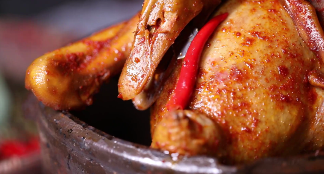 不肥不瘦的成鵝洗凈后 鹵煮至七八分熟 撈起后瀝干水分做“SPA” 涂上辣椒粉、茶葉、桂葉 鹽巴、生姜、大蒜等佐料 再用竹篾撐住鵝 放入鍋里