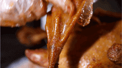 巖谷生春的“山場(chǎng)氣” 剛出鍋的嵐谷熏鵝 通體金黃,油滋滑潤(rùn) 煙香撲鼻,皮滑肉脆 表皮的油脂在煙火中 漸漸浸潤(rùn)出琥珀色的光澤