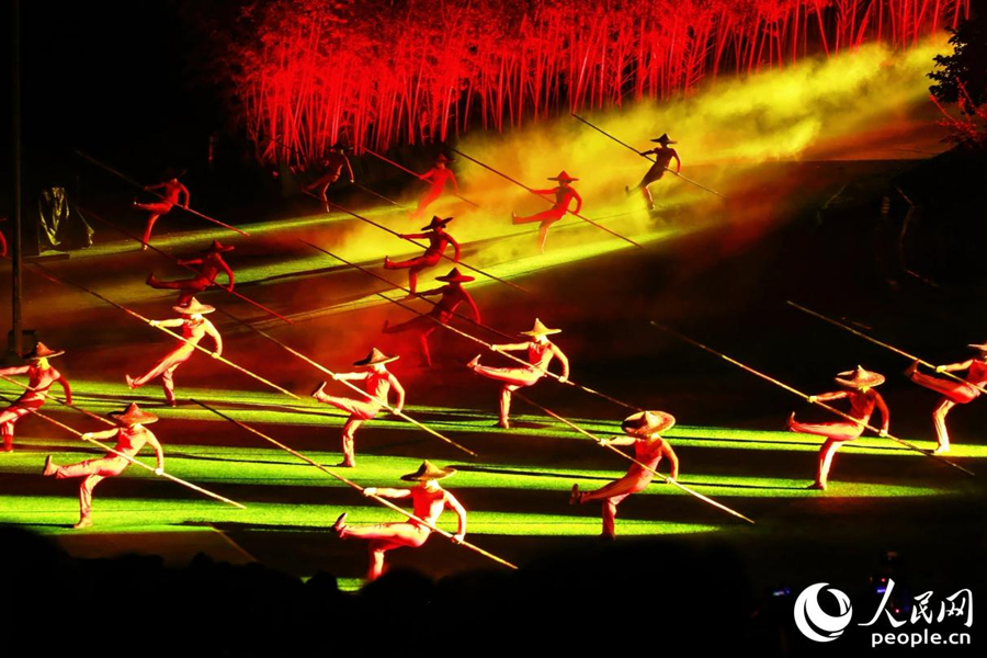 《印象大紅袍》演出將傳統(tǒng)技藝與現(xiàn)代舞美技術(shù)相融合,融入武夷茶農(nóng)搖青的場景。人民網(wǎng) 李唯一攝