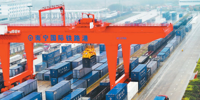 廣西南寧國際鐵路港是中國鐵路出口越南集散中心,也是中國西部陸海新通道的重要節(jié)點(diǎn)。圖為南寧國際鐵路港一片繁忙景象。