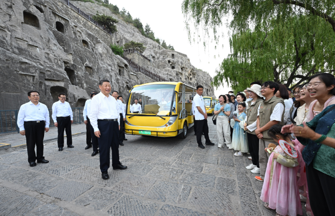 離開龍門石窟之際,總書記佇立草木豐茂的伊水之畔,遙望西山千龕拱列,盡覽博大文明氣度。粼粼波光的伊水,靜靜流淌。對岸,北魏的鏨痕、盛唐的鑿印,崖壁間鐫刻著恒久的文明印記。
