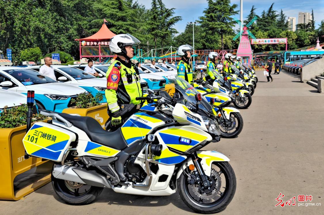 河南省三門峽市啟動(dòng)“任你乘風(fēng)破浪,保你追逐夢(mèng)想”第十五屆愛心送考公益活動(dòng),交警鐵騎、“愛心送考”車隊(duì)整裝待發(fā)。