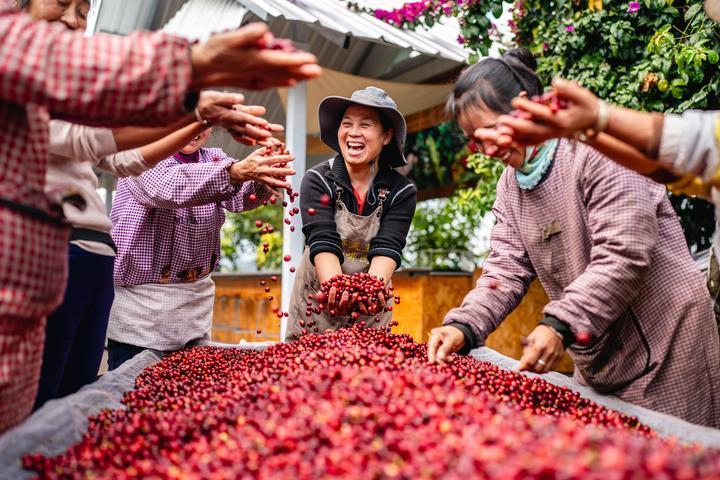 2025年1月8日,在云南省普洱市思茅區(qū)天玉咖啡莊園,工作人員慶祝今年咖啡豐收。目前,普洱市咖啡種植面積達(dá)67.9萬畝,2023到2024年產(chǎn)季咖啡生豆產(chǎn)量5.8萬噸,穩(wěn)居中國咖啡種植面積與產(chǎn)量之首。
