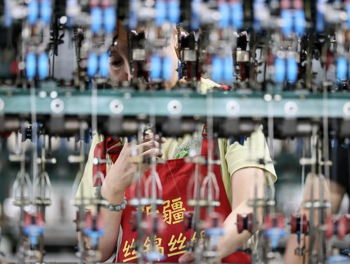 2025年7月29日,工人在新疆絲錦絲綢紡織有限公司生產(chǎn)車間內(nèi)的自動繅絲機(jī)上作業(yè)。近年來,新疆塔城地區(qū)烏蘇市引進(jìn)桑蠶繭絲綢智能化全產(chǎn)業(yè)鏈項目,鼓勵農(nóng)民種桑養(yǎng)蠶,拓寬興邊富民新“絲”路。