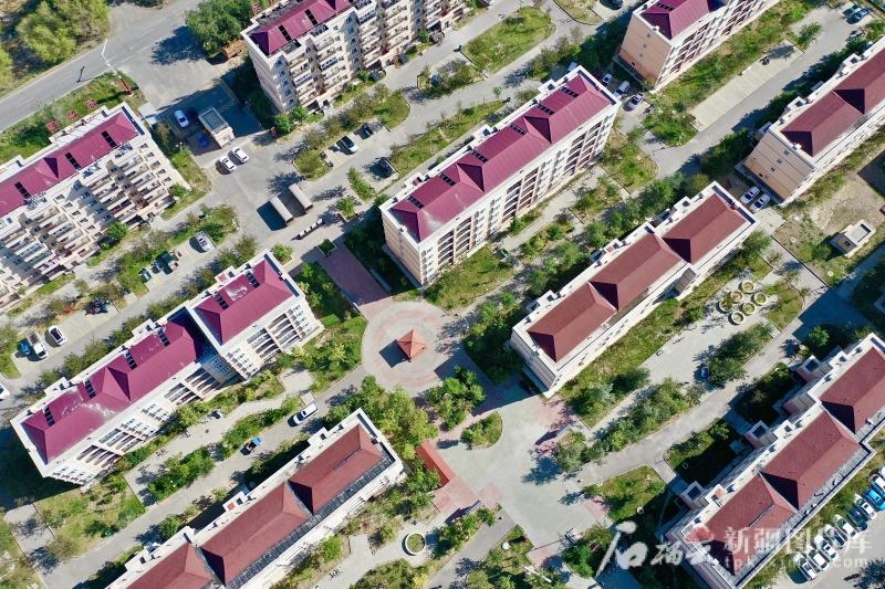 8月12日,昌吉市阿什里鄉(xiāng)的"天鵝小鎮(zhèn)",一排排整齊的樓房。(無(wú)人機(jī)攝)