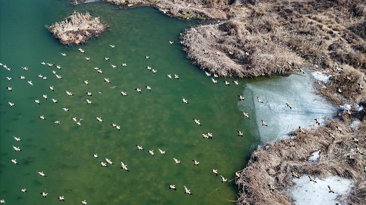 候鳥在黃河寧夏段一處濕地棲息、覓食(2025年2月26日攝,無人機(jī)照片)。新華社記者 王鵬 攝