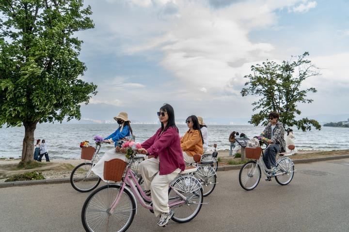 游客在云南大理洱海生態(tài)廊道騎行(2025年4月23日攝)。新華社記者 劉蓮芬 攝