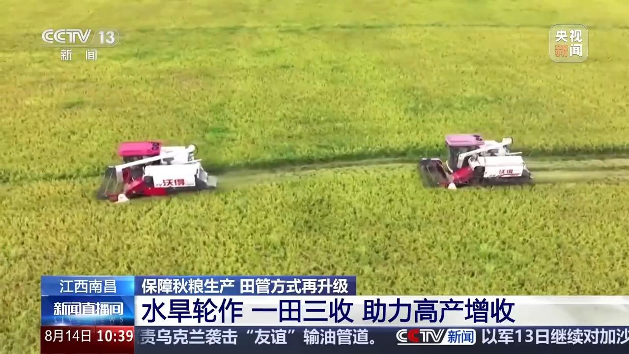 在江西南昌聯(lián)圩鎮(zhèn),一茬茬飽滿的稻穗被迅速收割、脫粒,裝入運輸車輛。而在收割機作業(yè)的田塊旁,翻耕起壟機正加緊作業(yè),農(nóng)戶們忙著清溝除雜、整理田地,為播種優(yōu)質(zhì)高產(chǎn)大豆做足準備。今年當?shù)夭捎盟递喿?、一田三收的種植方式,春季種水稻,初秋收完水稻后搶種大豆,秋末大豆收獲后緊接著種植耐寒蔬菜或油菜,三季作物茬口緊密銜接,全年無閑田。同時,通過推廣良種、測土配方施肥等技術(shù),確保每種作物都能優(yōu)質(zhì)高產(chǎn)。