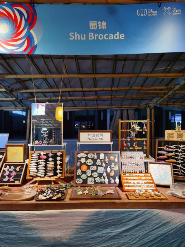 世運村里,泰國運動員"右甩""左翻"練起川劇水袖,意大利運動員饒有興味地制作新津繩編,日本選手在蜀錦工藝品前駐足……