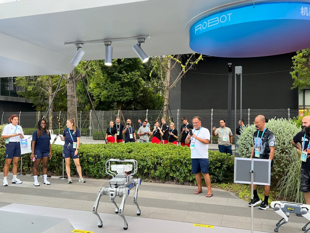 戴上AR翻譯眼鏡,葡萄牙運動員和德國選手開啟無障礙暢聊;美國選手一句"GoGo,帶我去熊貓商店",智能機器狗聞聲而動;土耳其選手和智能運動搭子練起了球;澳大利亞姑娘欣賞著美甲機器人噴繪的熊貓圖案……
