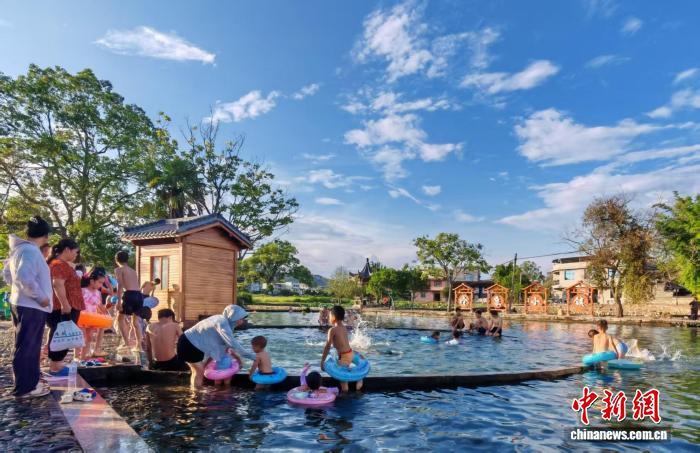 正值暑假,位于福建省清流縣李家鄉(xiāng)鮮水村的"冷泉小鎮(zhèn)"景區(qū)游人如織。不少村民推著手推車在景區(qū)穿梭售賣特色零食,與水池中人們的嬉戲畫面相映成趣,構(gòu)成一幅動靜相宜、生活氣息濃郁的民俗畫卷。