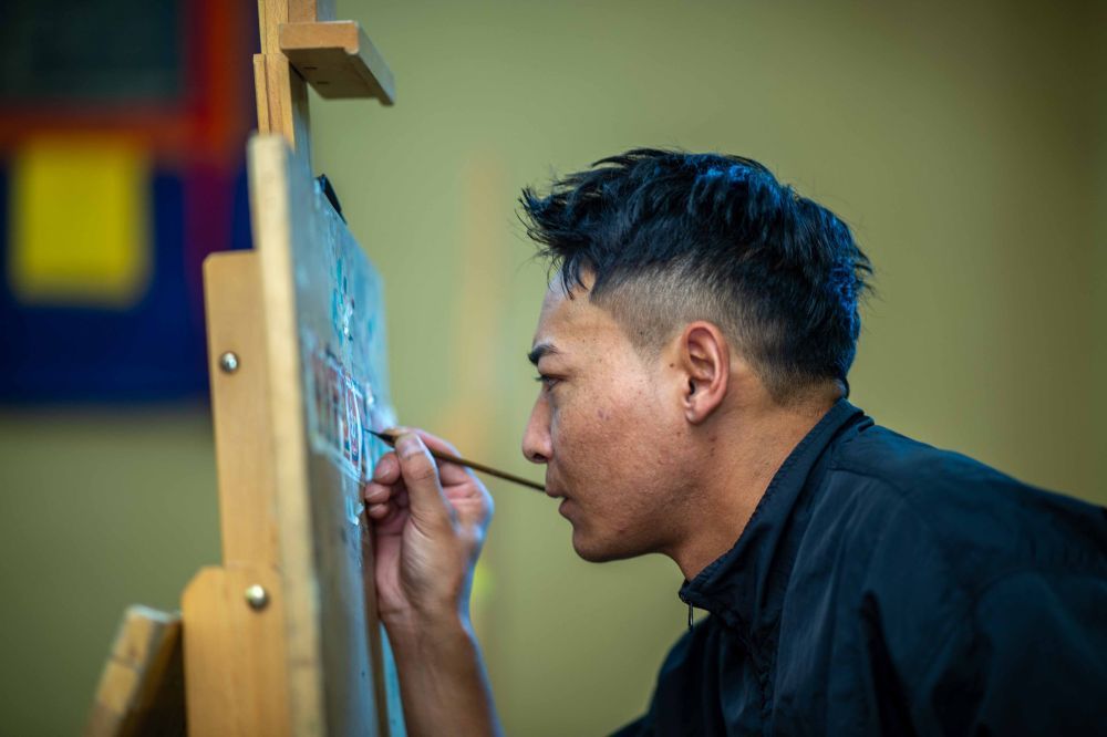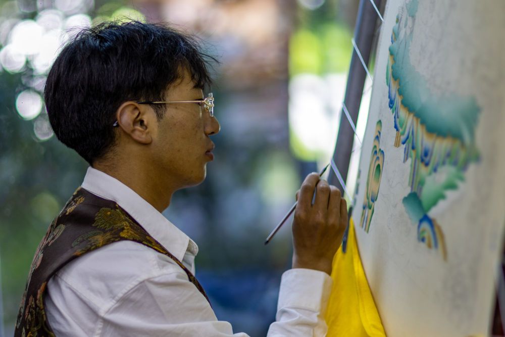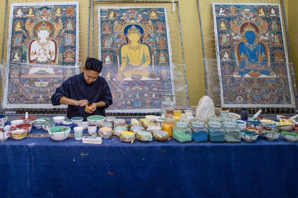 ↑ 8月6日,一名畫師在繪制唐卡。藏族唐卡(齊吾崗派)入選國(guó)家級(jí)非物質(zhì)文化遺產(chǎn)代表性項(xiàng)目名錄。
