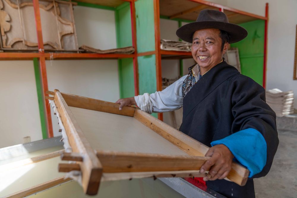 ↑ 8月12日,雪拉藏紙制作技藝自治區(qū)級(jí)代表性傳承人格桑旦增在制作藏紙。