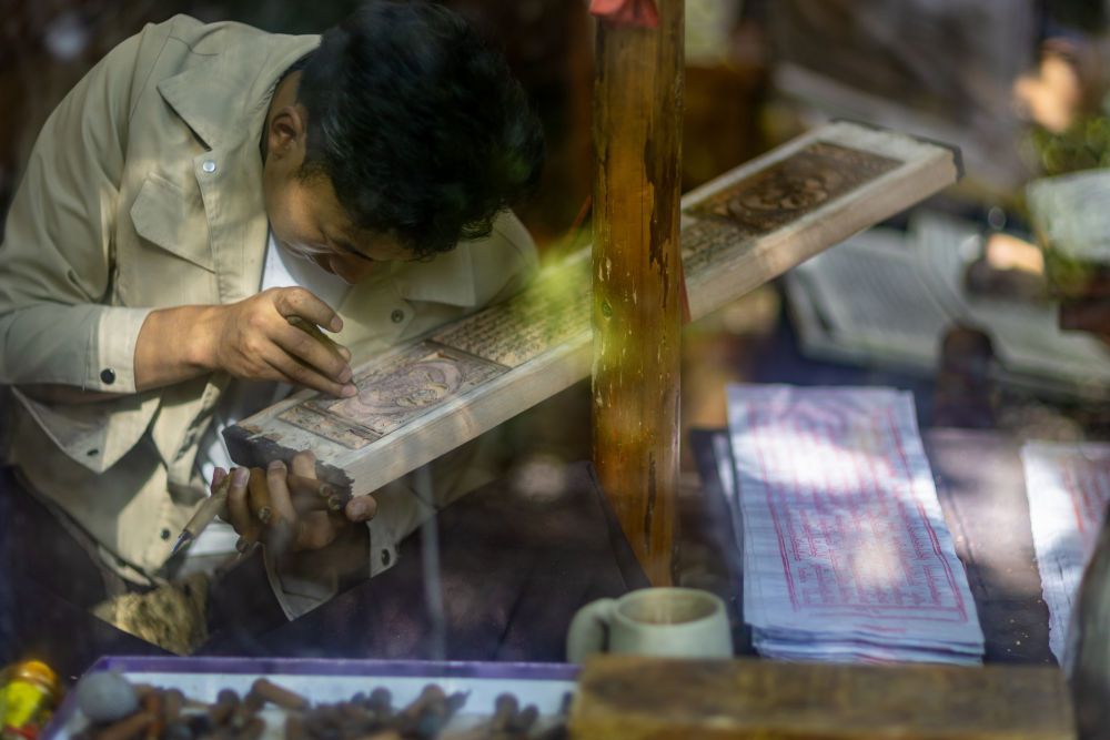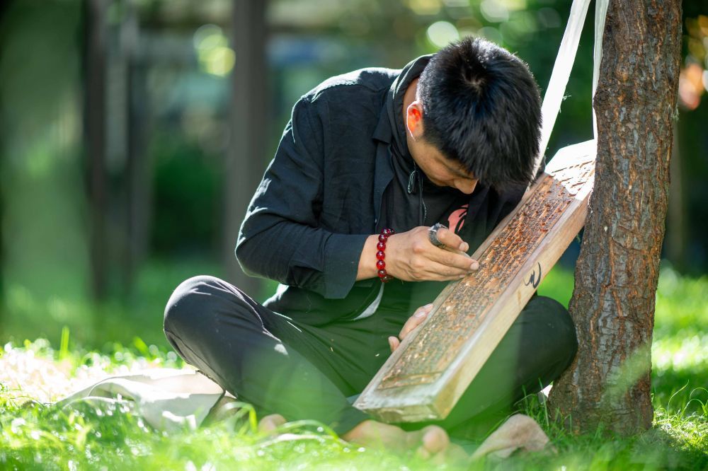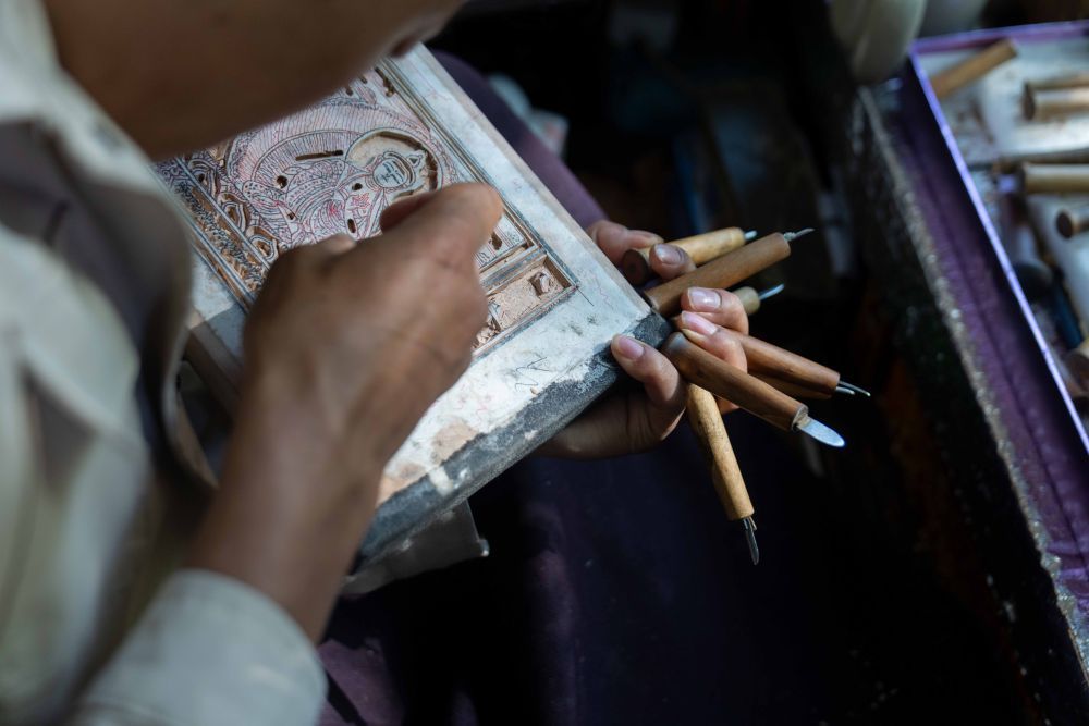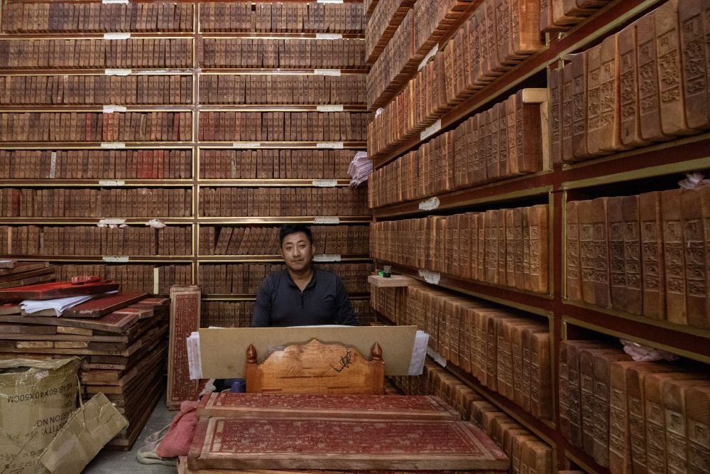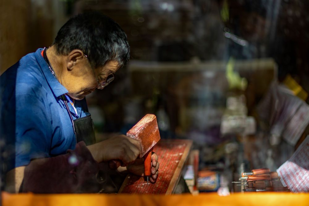 ↑ 8月6日,一名雕刻師在工作中。西藏雪巴康雕版印刷制作技藝入選西藏自治區(qū)級(jí)非物質(zhì)文化遺產(chǎn)代表性項(xiàng)目名錄。