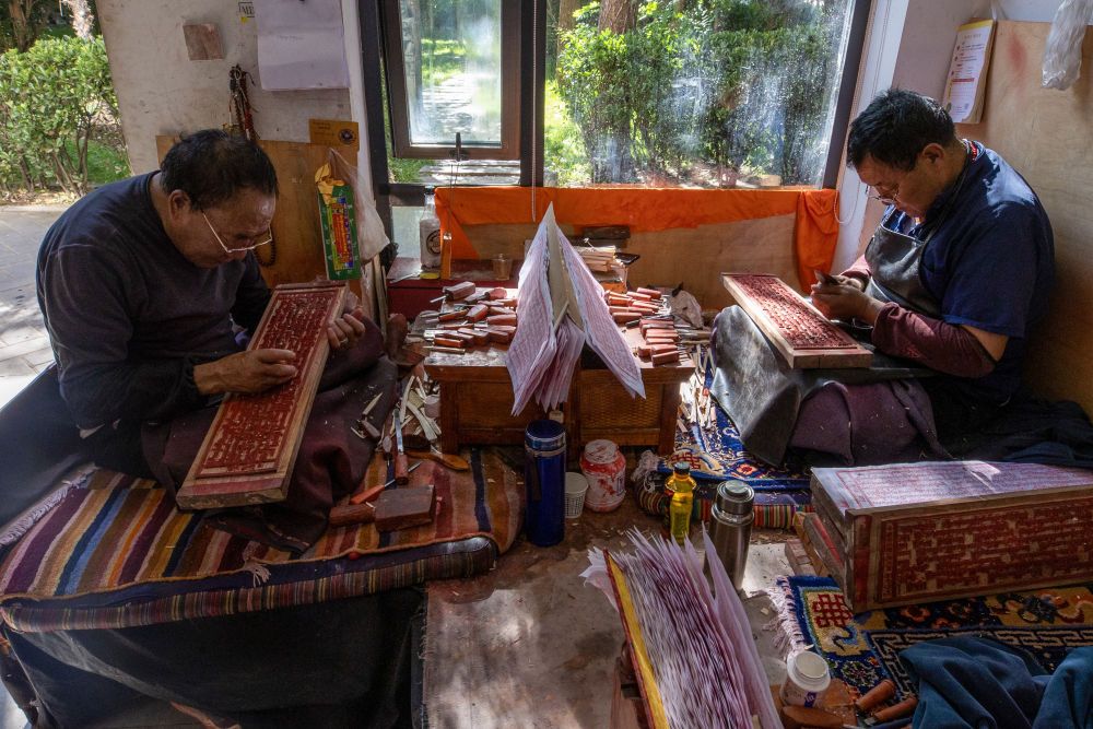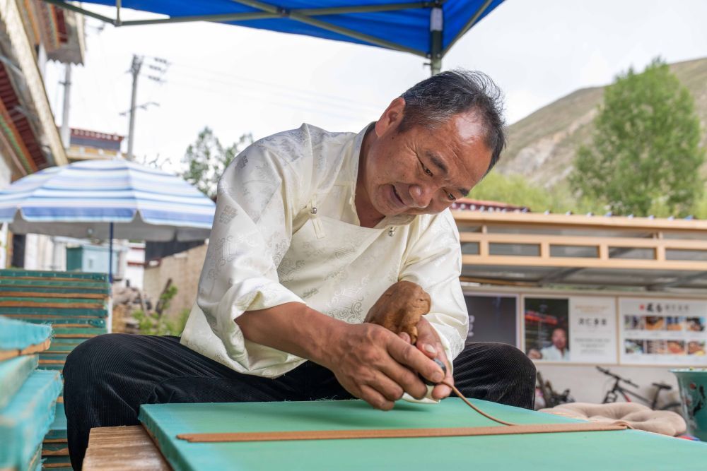 ↑ 8月6日,雕刻師在工作中。西藏雪巴康雕版印刷制作技藝入選西藏自治區(qū)級(jí)非物質(zhì)文化遺產(chǎn)代表性項(xiàng)目名錄。
