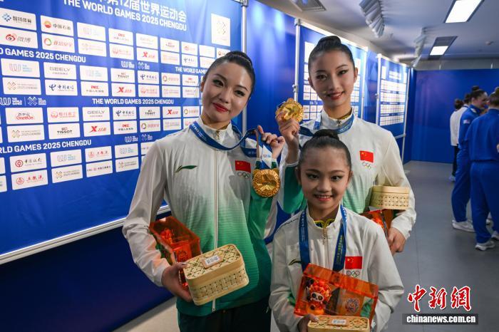 8月9日,中國隊(duì)選手丁雯妍、顧荃佳、馬一星摘得桂冠,三人展示金牌和竹編獎(jiǎng)牌盒。 中新社記者 劉忠俊 攝