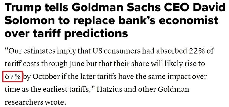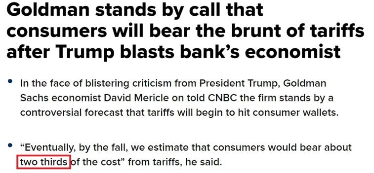 高盛經(jīng)濟學(xué)家大衛(wèi)·梅里克在接受采訪時仍堅持其預(yù)測,關(guān)稅成本將開始重點沖擊美國消費者的錢包,“到秋季,我們估計消費者將承擔(dān)大約三分之二的成本”。