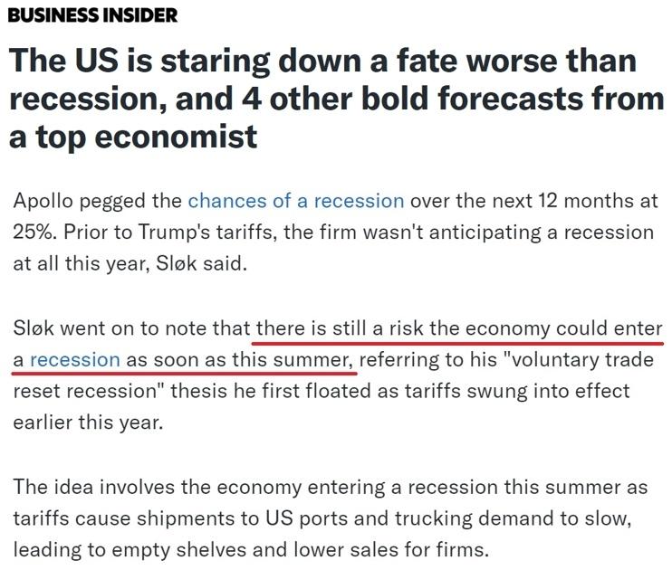 阿波羅全球管理公司首席經(jīng)濟學(xué)家托斯滕·斯洛克表示,如果美國政府不改變目前的關(guān)稅政策,美國經(jīng)濟連續(xù)兩個季度萎縮的可能性將高達(dá)90%,國內(nèi)生產(chǎn)總值預(yù)計將下降4%,美國今年一定會陷入經(jīng)濟衰退,而中小企業(yè)在此期間可能會面臨倒閉潮。