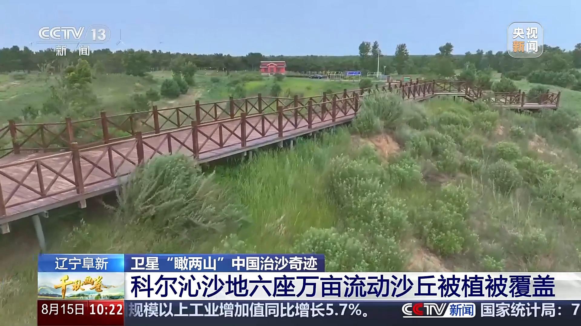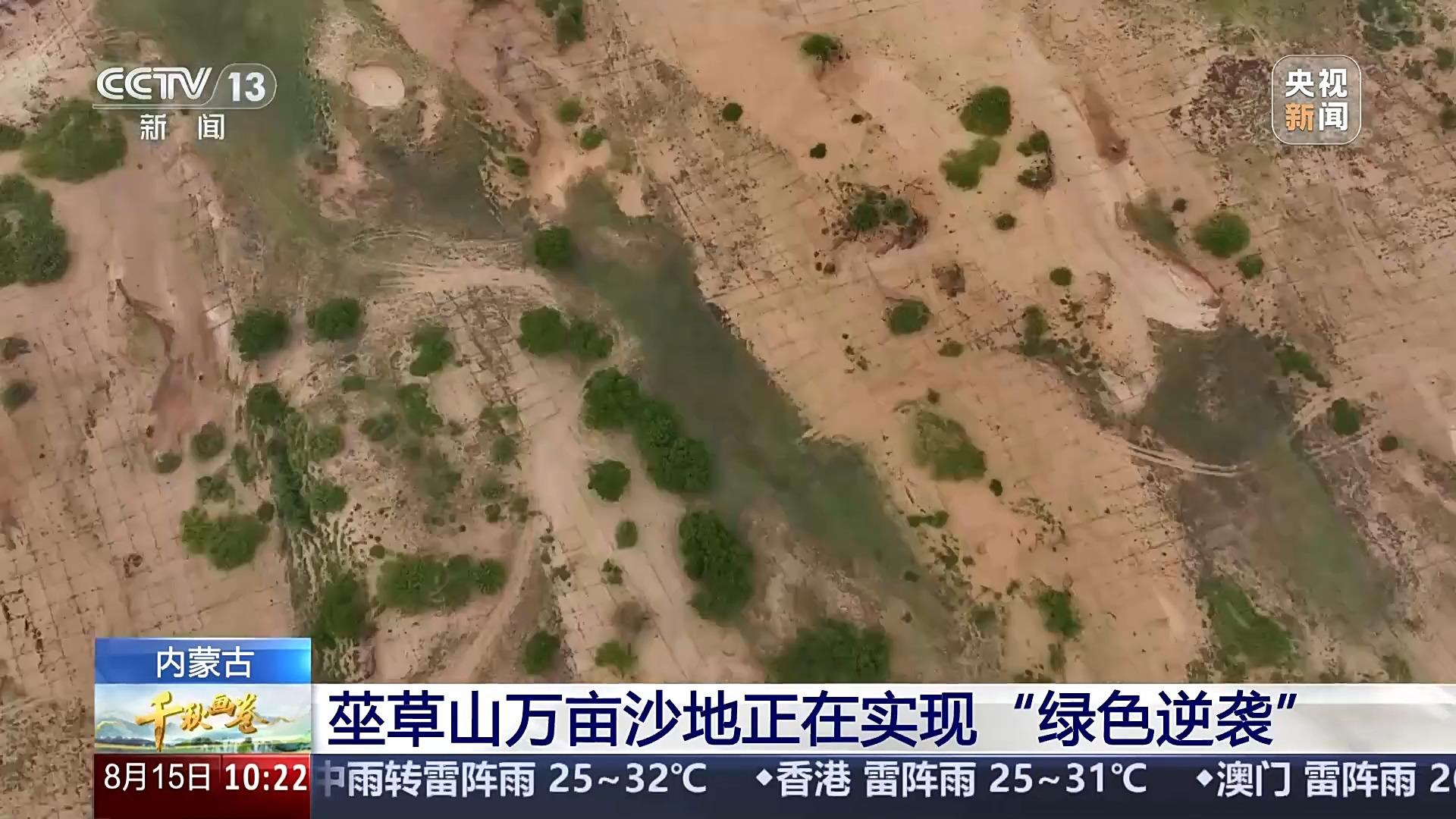 跟隨衛(wèi)星視角,這里是內(nèi)蒙古高原東部的渾善達(dá)克沙地。莝草山,位于赤峰市克什克騰旗,由于西北風(fēng)常年吹蝕,這里遍布沙丘和風(fēng)蝕坑。去年5月,當(dāng)?shù)貑?dòng)綜合治理。通過(guò)衛(wèi)星影像,我們能清晰地看到密密麻麻的草方格,如同編織的棋盤,縱橫交錯(cuò)、緊密相連,其中很多已經(jīng)萌發(fā)出綠意,牢牢鎖住流沙奔襲的腳步。