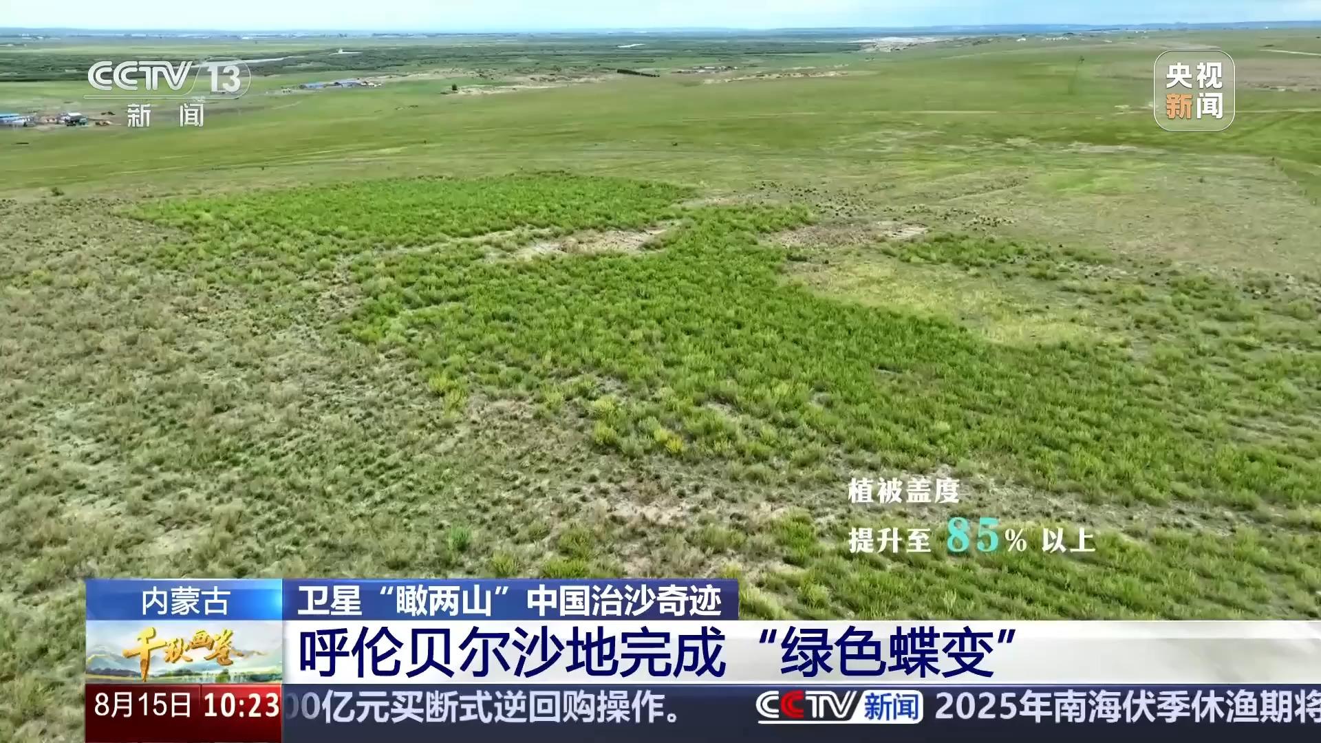 這里是內(nèi)蒙古陳巴爾虎旗,位于四大沙地中最北部的呼倫貝爾沙地。時(shí)間退回到2019年,這里卻是土地沙化的“生態(tài)重災(zāi)區(qū)”,流動(dòng)沙丘與風(fēng)蝕坑遍布。2020年,當(dāng)?shù)貑?dòng)退化草原生態(tài)修復(fù),現(xiàn)在修復(fù)區(qū)內(nèi)95%以上的流沙面積得到有效控制,植被覆蓋度提升至85%以上,實(shí)現(xiàn)了綠色蝶變。