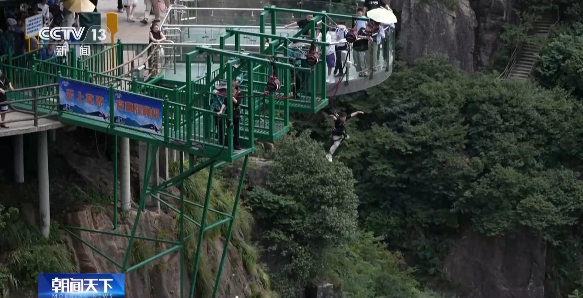 在浙江安吉云上草原景區(qū),游客穿好裝備,從高約30米的蹦極臺(tái)跳下,緩慢、勻速落到地面。這個(gè)暑期,“輕松”蹦極項(xiàng)目日均接待游客超千人。
